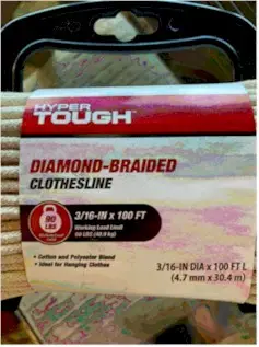 MATERIALS: clothesline (Walmart is the best), thread, heavy duty (jeans) needle, fabric cut in 1″ strips, two straight pins